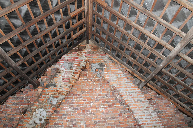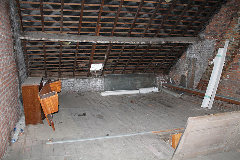 au grenier, nous avons pu constater que si la charpente était « relativement » en bon état (elle devait être surélevée et confortée par endroits),