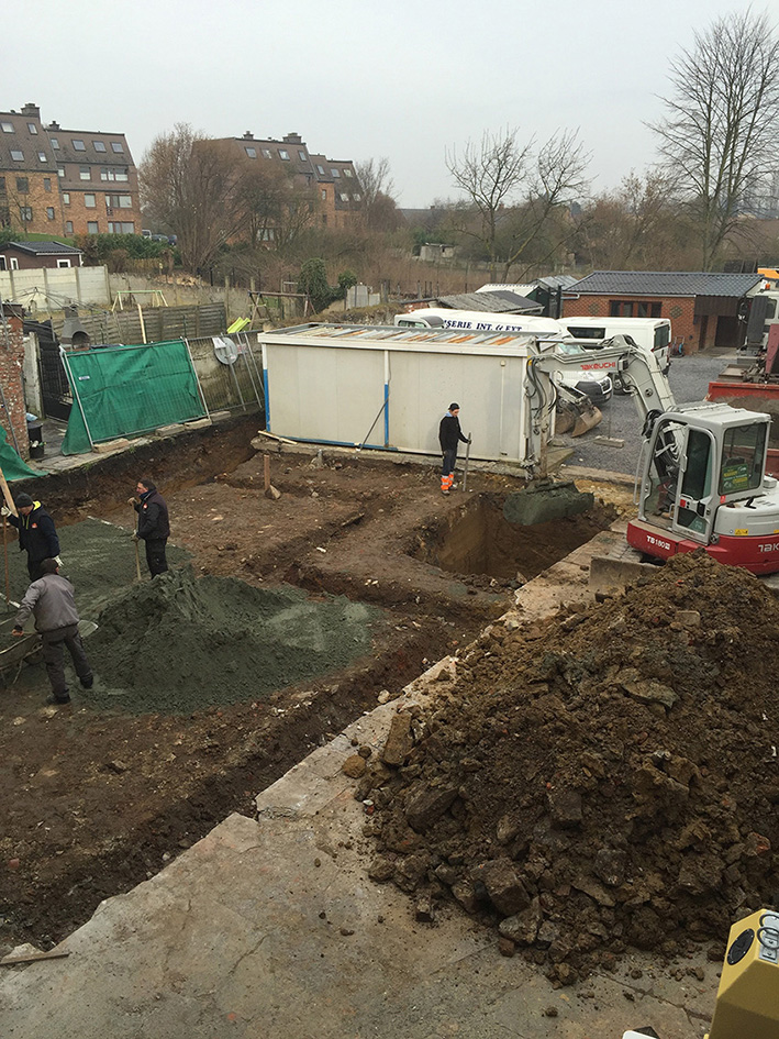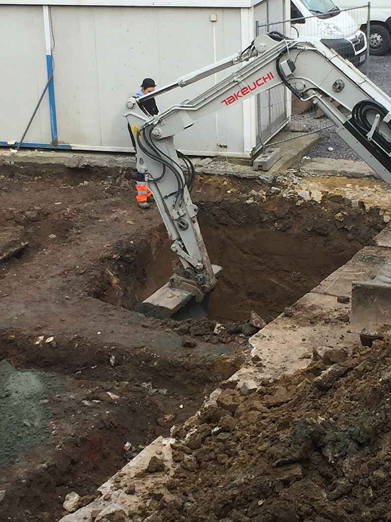 Au fur et à mesure des coups de pelleteuse hydraulique, l’extension de la cuisine(bâtiment du 17) et du restaurant (bâtiment du 19)