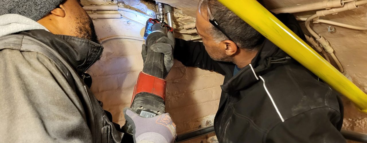De petites réparations (notre porte cochère a souffert cette année !) à l’entretien des bâtiments et des espaces verts de l’asbl, nous terminons l’année 2022 en commençant la première phase du plan d’amélioration des performances énergétiques de nos locaux. Nos stagiaires en « Sanitaire et chauffage » ont condamné les anciennes conduites d’une chaudière énergivore et installé de nouvelles tuyauteries vers une autre de nos chaudières. De nouveaux radiateurs ont aussi été mis dans l’atelier « repassage » de notre filière « Aide-ménagère ».